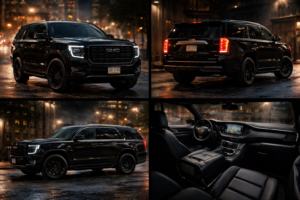 A Yukon Denali Night Edition in the kind of black that looks like it has depth. Not paint. Not color. A decision. Smoke-black tints. High-grade black rims. Clean. Mean. A truck that doesn’t ask to be let in. It arrives like it already has a reservation.